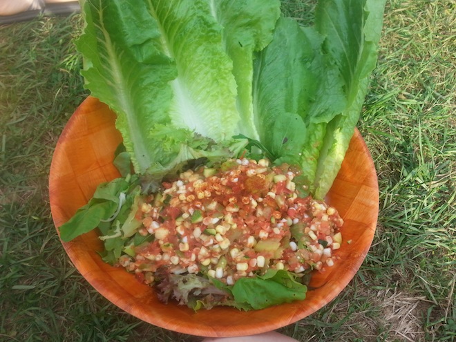 On Mexican night they served us this amazing corn stew. I believe it was just tomatoes, leeks, bell peppers, zucchini, lemon, lime, corn and cumin. It was soooooo goooooood. I just put the lettuce there for show - I mostly ate the stew.