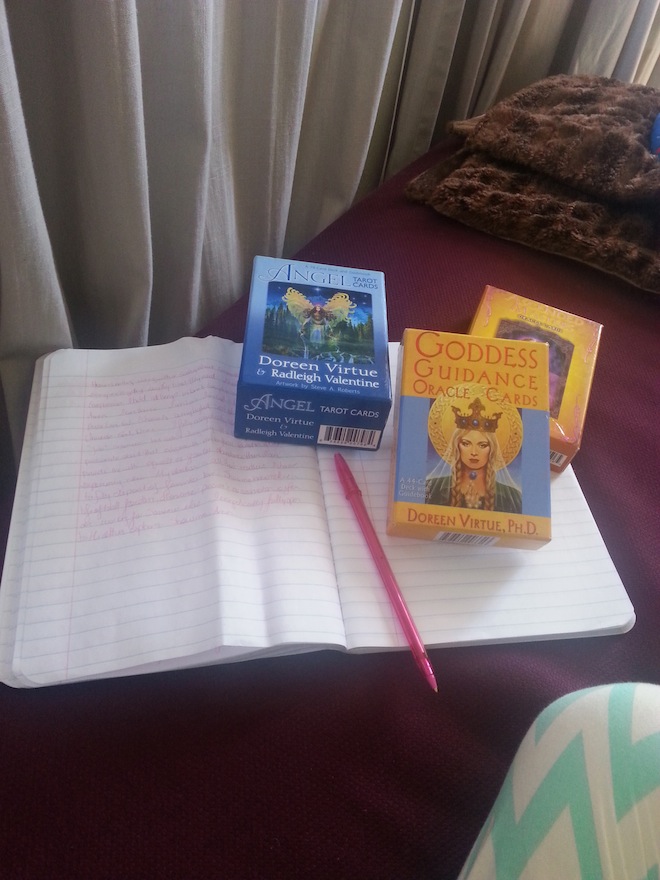For my evening tune in, I generally read my daily lesson from a Course In Miracles around 6 pm. I will then draw some angel cards, write in my journal, channel, whatever the day calls for.