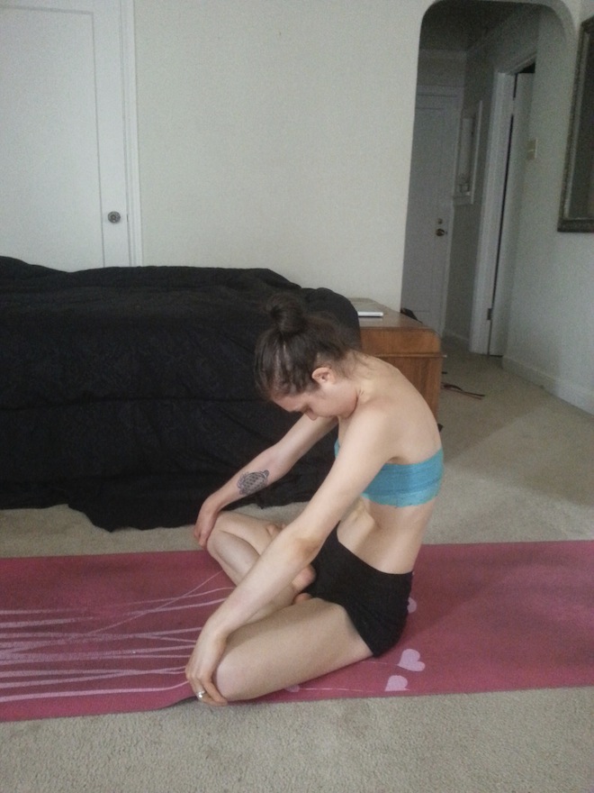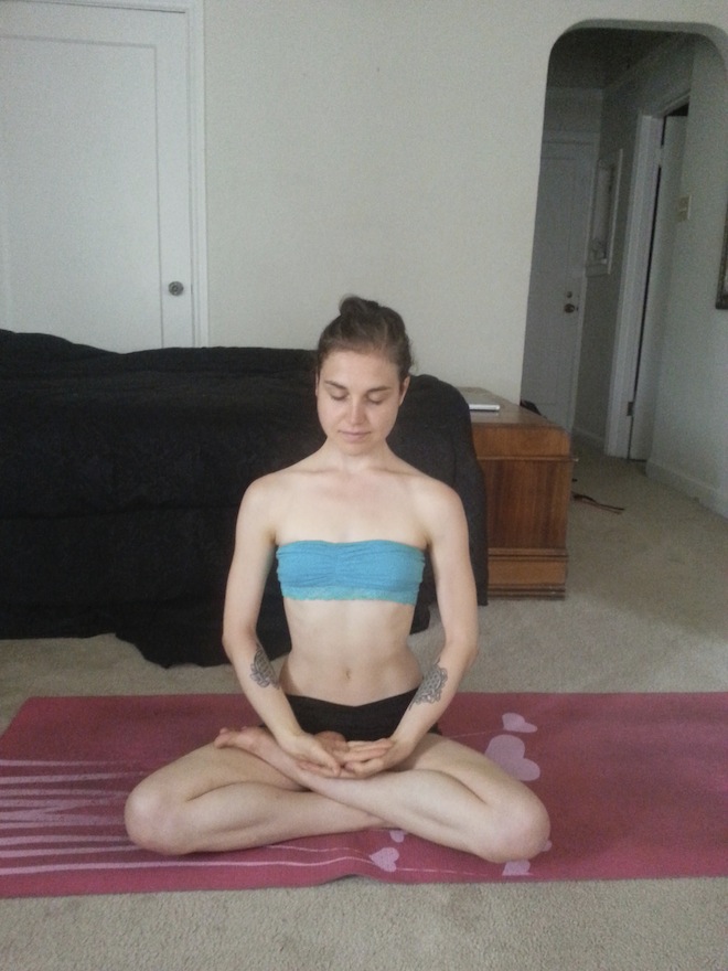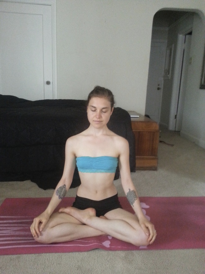 Every morning my practice starts with me rolling out of bed at 6 am straight to my yoga mat. My mat lives directly next to my bed so I can literally roll directly from bed to my mat 😉 I practice hatha style yoga for 1 hour, or 1 hour and 20 minutes if I decide to throw some pilates into the mix that day: