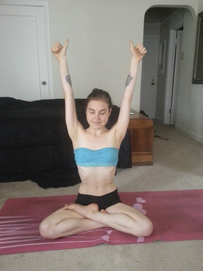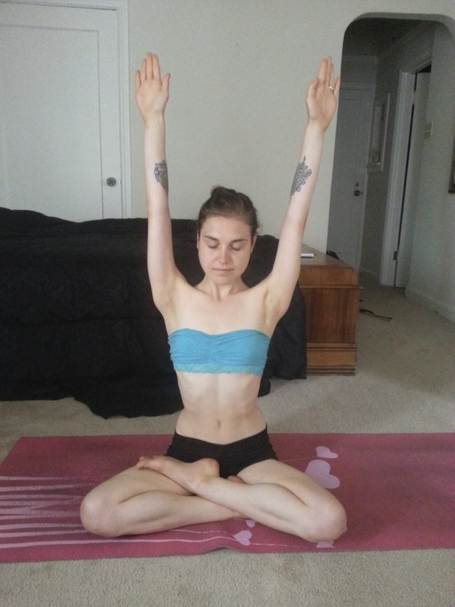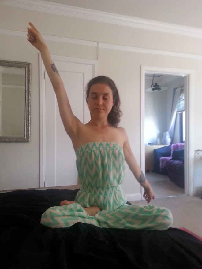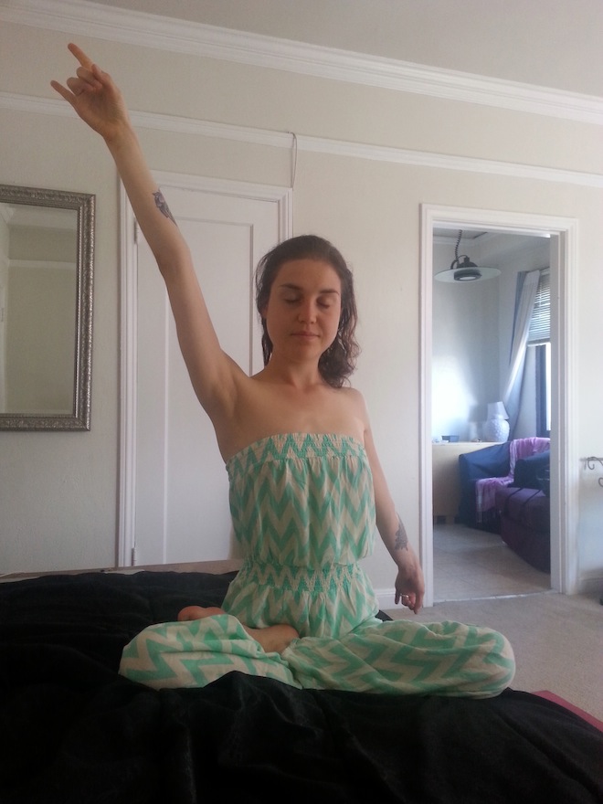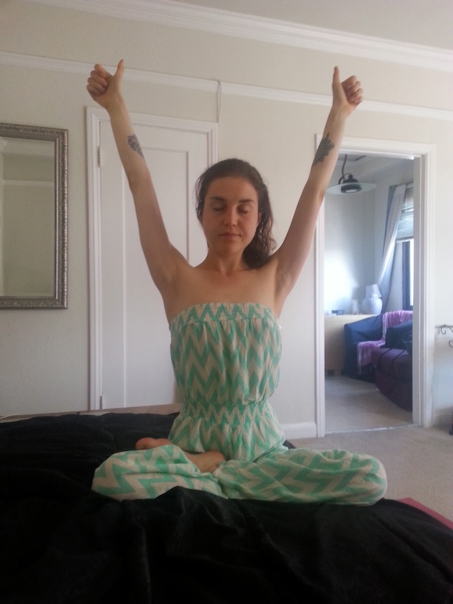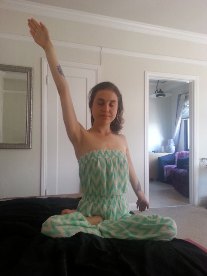 The final portion of the self love meditation is to take my arms straight up over my head, continuing to repeat my mantra for 3 more minutes.